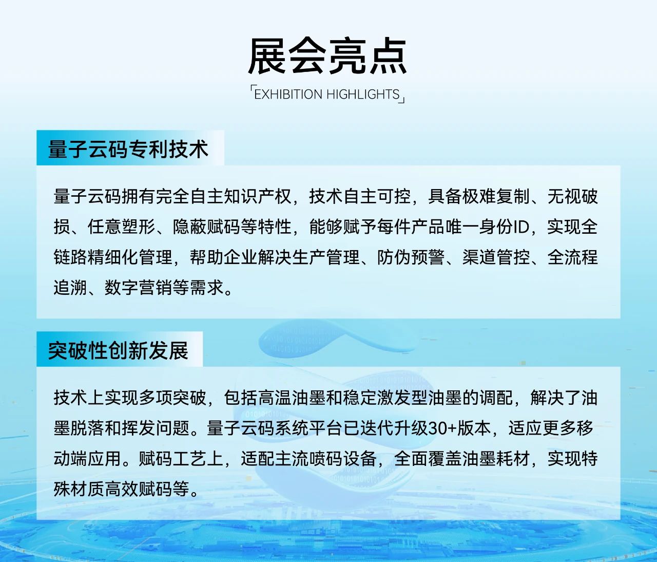 量子云码技术作为安全可控的一物一码载体追溯技术,能精确管理产品全生命周期,打破数据壁垒,实现企业、分销商、消费者间的高效连接,获取真实、全面、有效的数据,促进数据高效分级分类,并提升数据统筹能力。同时,该技术能精准实现生产要素的数字化与信息化,优化企业生产的整体数字化水平,推动企业向更高效、智能的生产模式转变,符合“释放数据要素价值,发展新质生产力”的峰会主题。