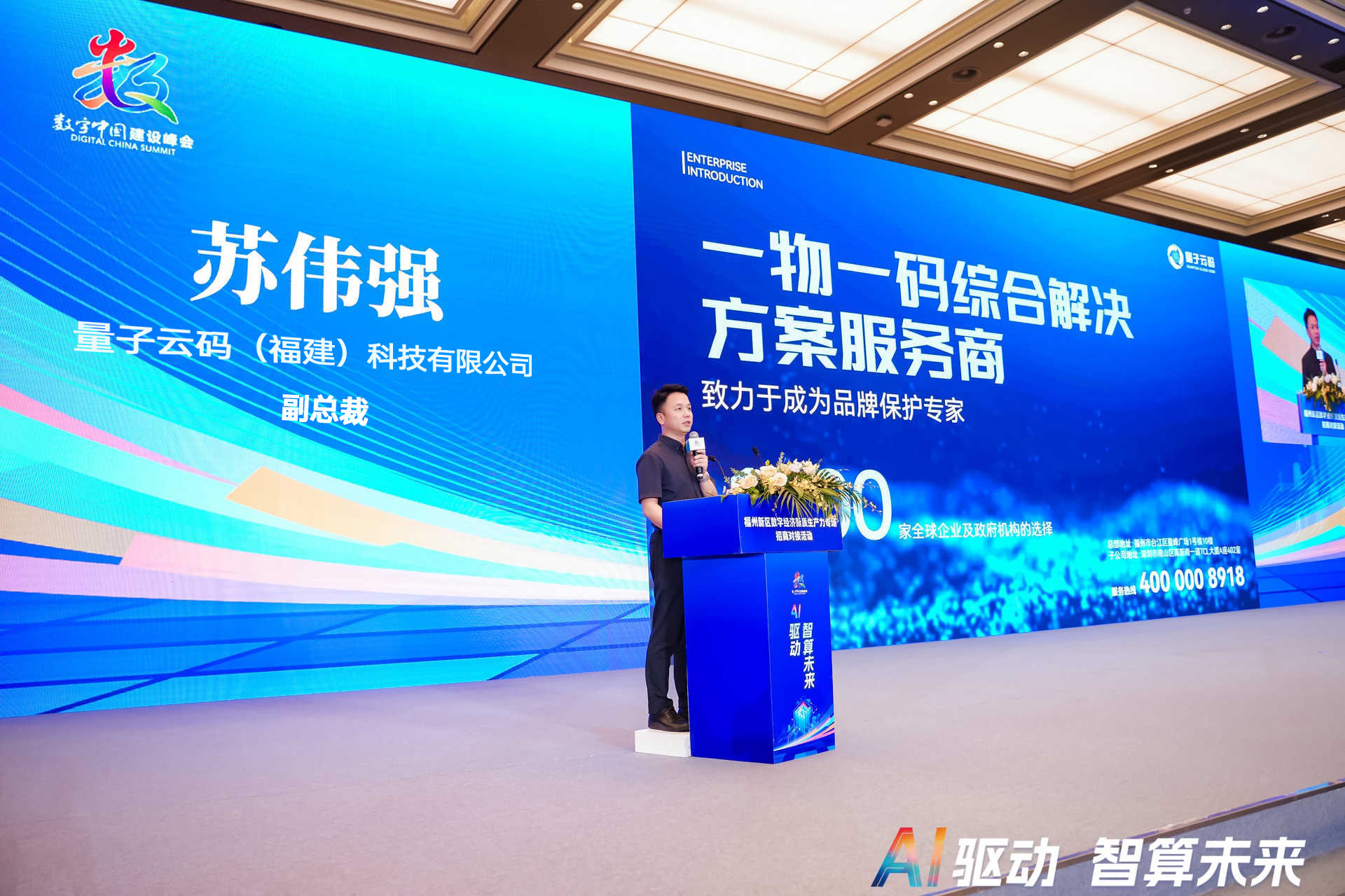 峰会期间,在23日上午举行了福州新区数字经济新质生产力招商对接会,会议聚焦前沿数字技术、创新产品及解决方案,旨在精准对接企业需求,助力破局市场挑战,推动产业转型升级。量子云码作为一物一码领域的领军服务商受邀出席,公司副总裁苏伟强在论坛上深入分享了量子云码核心技术、完善的产品体系、综合解决方案等,及其对新质生产力的贡献。